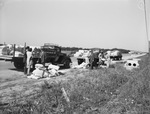 Employees of the Consolidated Vultee Aircraft Corporation (Convair) are continuing their costly strike. The Bucy-Ingram Company was delivering 100-pound sacks of powdered plaster to the plant when the delivery trucks lost a portion of their load. In all, sixty-three sacks were tossed from the delivery trucks. Deputy Sheriff Wilson arrived on the scene to investigate the incident. He is shown near the far left truck, wearing a hat. According to the Deputy, nine bags broke open on contact with the ground. The rest of the spilled shipment was slit with knives. Also on the scene is Deputy Sheriff Shelton, near the center truck in the hat.