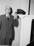 Bernard J. Fitzgerald is hanging up his conductors cap for the last time. He is retiring after fifty-seven years of railroading He spent the last few years as chief conductor on the Santa Fe's Fort Worth to Menard, Texas run. Mr. Fitzgerald is standing beside a fireplace, dressed in a three-piece pinstripe suit.