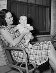 Mrs. Marion Lawrence Hicks is in Fort Worth, Texas along with her son Marion Lawrence Junior (Jr.) to visit her mother Mrs. H. D. McCracken and her Mr. Hicks' parents Mr. and Mrs. John C. Hicks. Mother and son are pictured here. Mrs. Lawrence is wearing a checkered dress and is sitting on a chair holding her baby. Both look happy. There is a window in the background. After the visit they will go to San Diego, California to live. Published in the Fort Worth Star-Telegram evening edition, May 12, 1946.
