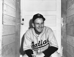 Dallas Rebels manager Al Vincent is an aggressive skipper and isn't afraid to rush onto the field to dispute a call. He admits that the Fort Worth Cats have a better infield, but his Rebels have power. He is squatting in front of a door wearing his Rebel's uniform with a Detroit Tigers cap. The Rebels are the minor league affiliate of the Detroit Tigers.