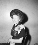 Mrs. Homer L. Davis is shown seated on a chair facing toward right and smiling. She is wearing a dress with a bow tie, a hat and a fabric flower brooch attached to her dress. She is holding a purse. Published in the Fort Worth Star-Telegram morning edition, May 17, 1946.