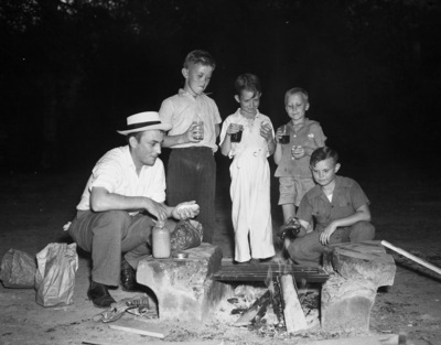 Left to right, Robert V. Crow takes his Sunday School class out for weiner roast; Horance Johnson, Joe Chas Ward, Henry Wilkerson and Billy Jo Gibson. They are gathered around the campfire and eating and drinking. Published in Fort Worth Star-Telegram.