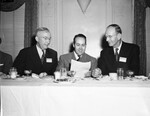 Educators stopped by a convention Friday night in Fort Worth, Texas to hear the social and political views of an industrialist. Seated at the speaker's table, left to right, are Wiley D. Rich, J. Louis Reynolds, and Doctor Rupert N. Richardson. Mr. Rich is a professor at Stephen F. Austin College. He is wearing a pinstripe suit. Mr. Reynolds is the executive vice president of the Reynolds Metals Company in Richmond, Virginia. He is practicing his speech, dressed in a tweed suit. Dr. Richardson is a professor at Hardin-Simmons University. He is dressed in a dark, double breasted suit.