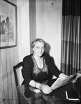Mrs. Thurston Roberts is chairman of the newly created department of postwar planning for the General Federation of Women's Clubs. The Jacksonville, Florida native is visiting Fort Worth, Texas to meet with local club women. Mrs. Roberts is sitting at a desk, reading a newspaper. She is wearing a dark dress, embroidered around the neck. There is a painting hanging on the side wall.