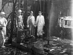 Crewmen on the Stanolind Oil and Gas Company No. 1 Lee Irish, section 18, are opening the first oil production in Hale County. Crew members are watching oil spurt from wells as it is swabbed. They are, left to right, Lee Tipton, J. L. Atchison, S. C. Easter, and Henry J. Laseman. Mr. Tipton is wearing a hardhat, a button-up shirt, and trousers. Mr. Atchison is dressed in a hardhat, long-sleeve shirt, and overalls. Mr. Easter is wearing a hardhat, long-sleeve shirt and overalls. Mr. Laseman is wearing a hat and a jump suit.
