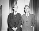 The Southwestern Social Science Association is holding their first postwar meeting at the Hotel Texas in Fort Worth, Texas. The organization's newly elected officers, left to right, are W. E. Gettys and Cortez A. M. Ewing. Mr. Gettys, president, is a professor in the University of Texas department of sociology. He is dressed in a three-piece suit. Mr. Ewing, vice president, is a professor in the government department of the University of Oklahoma. He is wearing a three-piece striped suit.