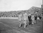 General Dwight D. Eisenhower is leading the march into Kyle Field, Sunday for the annual Aggie Muster at Texas A&M. The Muster is a celebration of camaraderie as the school comes together to remember the lives of lost Aggies To the right of General Eisenhower is Lieutenant Colonel William A. Becker, of Kaufman Texas. Immediately behind the leaders are Speaker of the House Sam Rayburn and Lieutenant Colonel Tom Dooley. In the back is Captain Eli L. Whiteley Aggie Class of 1941. He is one of two Congressional Medal of Honor winners from A&M.