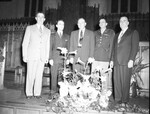 Texas A&M College is holding their annual Aggie Muster. The Muster is a celebration of camaraderie as the school comes together to remember the lives of lost Aggies. The 43rd annual muster is being held at First Methodist Church in Fort Worth, Texas. In attendance, left to right, are Ed Baker, Reverend Ervin Gathings, Melvin J. Miller, Captain H. E. Cunningham, and Uel Stephens. They are standing at on stage at the front of the church.