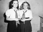 Residents of Fort Worth, Texas are making contributions to the Baby Hippo Fund. The donations soon will be enough to bring hippopotamus Memphis Belle to the Forest Park Zoo. Two of the repeat contributors, left to right, are Janace Ann Hamilton and Carolyn Williamson. The girls are members of the Gardenia Bluebird Group. They are delivering a two-dollar donation on behalf of the group. They are wearing matching outfits - blouse, scarf, and a skirt.