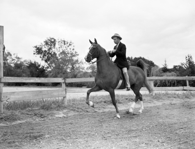 Image shows "Burger Boo's Dream," horse owned by James M. North Junior. The horse is being ridden by an unidentified man; they are in a pasture surrounded by a wooden fence.