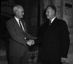 Presbyterian Church Officials are holding a meeting at First Presbyterian Church in Fort Worth, Texas. Representatives from seventy-five churches are attending the session. Congratulating each other on their new positions, left to right, are Reverend B.O. Wood and Reverend Frank D. Travis. Reverend Wood, of San Angelo, Texas, is the new moderator of the Presbytery of Mid-Texas. He is wearing a striped suit. Reverend Travis, of Denton, Texas, is the new moderator of the Presbytery of Fort Worth. He is dressed in a double breasted suit.