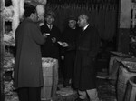 The coldest spot in Fort Worth, Texas was inside the refrigeration room at the Armour & Company. The men in overcoats, left to right are Jorge Pino Sandoval, D. G. Barron, A. A. Lund, and R. C. de Zayas. Mr. Sandoval is a journalist visiting from Mexico City, Mexico. Mr. Barron is the superintendent of the plant. Mr. Lund is the general manager of the packing plant. Mr. Zayas is a refrigeration executive from Mexico.