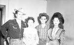 The Knight's of Columbus are hosting a '49 Party. Preparing for the festivities, left to right, are Carl M. Johnson, Mrs. Carl M. Johnson, Phil Hopkins, and Mrs. Barbara Colbert. Mr. Johnson is dressed in a cowboy hat, western shirt, and jeans. He has a gun holstered on his hip. Mrs. Johnson is wearing a vintage old west dress. Mr. Hopkins is dressed in a cowboy hat, plaid shirt and jeans. Mrs. Colbert is a feathered hat and a vintage old west dress.