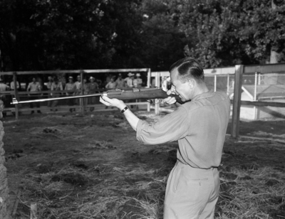 Image shows Elephant at Forest Park Zoo, "Sugar" raised her snout to trumpet a swan song a few minutes before her execution. She was sentenced to die after a savage attack on her zookeeper. Zookeeper Harry Jackson raised his rifle through the barred windows to end her life. Published in the Fort Worth Star-Telegram morning edition July 13, 1940.