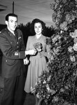 A newlywed couple is arriving at their new home in Fort Worth, Texas. Major Max Clark is presenting his wife with a bouquet of red rambler roses to celebrate the occasion. Mrs. Clark, formerly Russian Princess is now a Texas bride. The couple married in France. Major Clark is dressed in his military uniform. Mrs. Clark is wearing a dress and a pearl necklace.