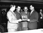 Friends and colleagues are throwing a going away party for Mike Brumbelow, line coach for the Texas Christian University (T. C. U.) football team. He recently announced his resignation. Pictured left to right are Clay Berry, Coach Brumbelow, Morris Frank, and Charley Needham. They are shown presenting Coach Brumbelow with a silver set. Mr. Berry is president of the Frog Club. He is dressed in light-colored suit. Coach Brumbelow is wearing a double breasted suit. Mr. Frank is a reporter with the Houston Post. He is dressed in a double breasted, striped suit. Mr. Needham is president of the Frog Ex-Letterman Club. He is wearing a suit.