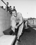 Track star John Alexander is returning to Paschal High School to compete in a track meet Friday in Dallas, Texas. He is shown at the side of the bleachers, lacing his cleats. He is dressed in a sweatshirt and sweatpants.