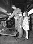 What makes it go? Little Yvonne Florida and W.T. Rufner, learn about servicing trains from Jack Sparks, a T&P Railroad employee. The children were part of a group of children from Bedford School who were on a school field trip. Photograph shows Mr. Sparks, dressed in overalls and cap standing next to a male and female child. The male child is dressed in western attire and wearing a western hat. The little girl is wearing a vest and skirt ensemble. Mr. Sparks is performing some kind of service on the train. Published in The Fort Worth Star-Telegram Evening Edition April 26, 1946.