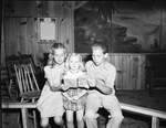 The Doyle Mission is a local hangout where children gather everyday after school. The mission is working on a project to expand beyond their single church building. Sitting on a bench and singing hymns, left to right, are Dorothy Richardson, Frances Meggs, and Edward Tallant. Dorothy is wearing a dress with four buttons along the top. Frances is wearing a plaid dress. Edward is dressed in a button-up shirt with cuffed sleeves and trousers.