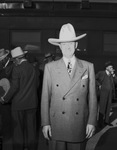 A group of directors and top flight executives with the Santa Fe Railway are traveling to Fort Worth, Texas on an inspection trip. Railway president, Fred G. Gurley is pictured upon arrival at the train station. He is dressed in a ten gallon hat and a double breasted suit.