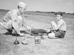 It's fun, boy! Excitement ran high Saturday among the first-day entrants in Fort Worth Army Air Field's model airplane contest, including James David Pipkin (right) who entered a model plane in the contest. Photograph of a Civil Air Patrol cadet, and James David Pipkin. The cadet and Pipkin and both crouched next to a model airplane on the ground. The cadet is wearing his military uniform. Pipkin is wearing a baseball cap, shorts, and a shirt. Published in The Fort Worth Star-Telegram Sunday Edition April 28, 1946.