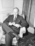 Harold E. Stassen, governor of Minnesota and possible candidate for Republican presidential nomination in 1948 or 1952, relaxes during a stop en route to San Angelo, Texas where he will address the Texas Junior Chamber of Commerce. Mr. Stassen is sitting on a chair and holding a cup of coffee. Published in the Fort Worth Star-Telegram evening edition, April 27, 1946.