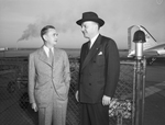 Santa Fe officials Fred Lindall, San Angelo, Texas, left, and Harold E. Stassen are standing outside in front of a chain link fence. Both men are wearing suits and Mr. Stassen is wearing a hat. There is an airplane behind the fence. Published in the Fort Worth Star-Telegram.