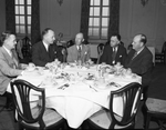 Sitting at a table, left to right, are Santa Fe officials Fred Lindall, San Angelo, Texas; Harold E. Stassen, Murray Kyger, Fort Worth, Texas; Arch Harville, Little Rock, Arkansas; and Ned Hoffman, Fort Worth, Texas. The five men are wearing suits. On the table are bowls, cups, and utensils. Published in the Fort Worth Star-Telegram.