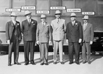 Party at Shady Oak Farm for Santa Fe, New Mexico, officials. Standing left to right: E. J. Engel, G. E. Duffy, J. H. Keefe, R. G. Rydin, J. C. Gibson and B. L. Hupp. The men are standing outdoors in front of a train. They are wearing suits and ties, hats and dress shoes. They are all smiling and have their arms at their sides, except for Mr. Duffy who has his arms behind his back.