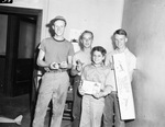 Model plane winners. First place winners in Fort Worth Army Air Field's model plane contest are shown with their prizes. Back row, left to right, Jimmie Eastland and Gene Maye with model plane motors awarded them for U-controlled models; David Bayless with a model air plane kit presented for his P-47 solid scale and (front) Katie Beth Hunter, awarded a cosmetic set for her solid scale model in the girls' class. Published in The Fort Worth Star-Telegram Morning Edition April 29, 1946.