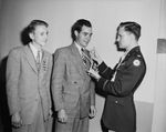 Captain Jack Chilcoat, right, is presenting the Degree of Chevalier to Weldon Lee Wallace, center, in recognition of outstanding DeMolay work. Vance Hendricks, left, is receiver of the order's highest personal award, the representative DeMolay Award. He is a student at Paschal High School. The ceremony was held in Arlington Heights Masonic Temple. Mr. Hendricks is wearing a suit and has a medal pinned to his lapel. Mr. Wallace is dressed in a double breasted suit with medal around his neck. Captain Chilcoat is wearing his military uniform.