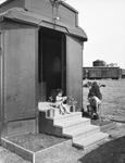 Roman Guerra, 1, left, and his older brother, Ramundo, 9, play on the doorstep of a railroad coach that has been converted into a bunkhouse in the freight yards of the Burlington Lines. The entrance is decorated with flower beds and potted plants. Their father works for the Fort Worth and Denver City Railroad Company. Published in the Fort Worth Star-Telegram evening edition, May 3, 1946.