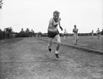 Don Sparks is a track star from Fort Worth Tech. He is shown out of the starting hole and off fast in his daily test against a stop watch. He is dressed in a sleeveless t-shirt with a "T" and wings across the chest and shorts. There are boys on the football field in the background.