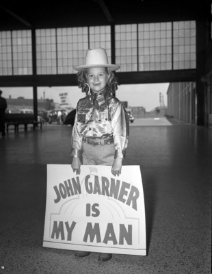 The Hardin-Simmons University band staged a noisy demonstration in the Texas and Pacific Station during a brief stop en route to the Democratic National Convention in Chicago, Illinois. Shown here is Diana Sandefer, 5, band mascot, daughter of G. B. Sandefer, the band manager. She is the granddaughter of Doctor J. D. Sandefer, former president of the univeristy who died recently. She is holding a sign that reads, "John Garner Is My Man," in support of John Nance Garner, who is seeking the presidential nomination at the convention. Diana is wearing a satin blouse, trousers and a cowboy hat.