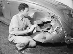 F. W. Barton, Convair employee, is examining the damaged left rear fender of his car, which was shattered early Wednesday morning by a stick of dynamite. The automobile was parked in the driveway near his home. A similar charge was placed in the gas tank of an automobile belonging to A. O. Chewning, which did not explode. Mr. Barton is wearing a button-up shirt with cuffed sleeves and trousers.