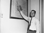 J. M. "Star" Williams, Moslah potentate, is pointing to a map demonstrating the Moslah Temple Shriners pilgrimage. The two-day pilgrimage will be attended by 400 Moslah Temple Shriners and their wives to east Texas. The trip will center around Shreveport, Louisiana, where he is pointing to on the map. Mr. Williams is wearing a dress shirt, necktie, and trousers.