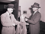 Deputy Sheriff Bill Shelton, left, and Deputy Sheriff Paul Williams, examine blood stained clothing believed to have been worn by a man who shot Ivan J. Poole near Arlington, Texas. The clothing was found in a creek on the east side of Hensley Field. Sheriff Shelton is holding a pair of trousers, a fountain pen and a money clip, and Sheriff Williams is holding a coat. The sheriffs are both wearing suits and fedoras. Published in the Fort Worth Star-Telegram morning edition, May 1, 1946.