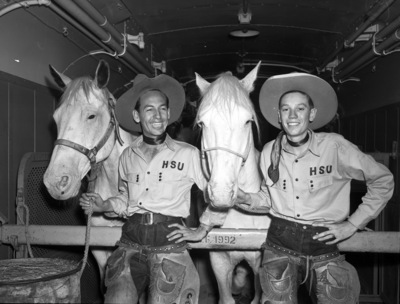 The Hardin-Simmons University band staged a noisy demonstration in the Texas and Pacific Station during a brief stop en route to the Democratic National Convention in Chicago, Illinois. Left to right, posing with two of the six white horses taken along with the band, are Bernard Kirkpatrick, of Sweetwater, Texas, and Von Ceal Brantley, of Dalhart, Texas. Silver King is on the left and Sonny is on the right. Kirkpatrick and Brantley are wearing collared shirts that have "HSU" printed over the left breast pocket, jeans, chaps, and cowboy hats.
