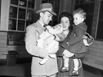 Harry L. Binger holds his nine-week-old daughter Christine Binger. Mrs. Harry L. Binger stands to his left holding their 18-month-old child Harry L. Binger, Junior. The family gathered at Texas and Pacific Station for a happy reunion. Mrs. Binger and Harry L. Jr. are wearing coats and Mr. Binger is wearing a suit and a fedora. Published in the Fort Worth Star-Telegram evening edition, May 1, 1946.