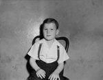 Robert Joe Woodson, five-year-old son of Mrs. R. C. Woodson, donated five dollars to the Forest Park Zoo Baby Hippo Fund. Robert donated the money to help Forest Park reach it's fundraising goal to get a hippo in the zoo. Robert is sitting in a chair and wearing a button up shirt and suspenders. Published in The Fort Worth Star-Telegram Morning Edition May 2, 1946.