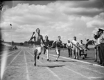 Garland Polk, Texas Christian University, left, finishes ahead of Bill Adams, North Texas State, right, and Harold Bartlett, Southern Methodist University, center, in a track event. Published in The Fort Worth Star-Telegram Morning Edition May 2, 1946.