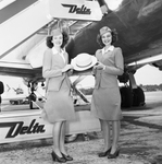 Lee Jenkinson and Frances Cooper, Delta Airlines flight attendants holding a hat sent to Amon Carter by Mayor Herbert Frink of Miami Beach, Florida. The women are dressed in their uniforms, which consist of a skirt, blouse, jacket and beret. They are standing in front of a Delta four-engine Douglas airliner.