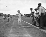 The annual elementary school relay carnival is being held Thursday and Friday at Farrington Field. Participating in the Class E 400-yard relay is William Holcomb. He is an 11-year-old student at Polytechnic Elementary School. William is shown breaking the tape in final link of the relay. At a mark of 62 seconds, his team set a meet record. A group of men are standing on the sidelines as William passes the finish line.
