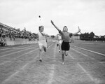 The annual elementary school relay carnival is being held Thursday and Friday at Farrington Field. Participating in the Class D girls' relay race, left to right, are Beverly Lou Breckenridge (Carroll Peak) and Nancy Graves (Polytechnic). The girls are shown in a photo-finish with Nancy Graves lunging forward for the win. Coming up fast behind is third place finisher Nancy Baker, of Oakhurst Elementary School.