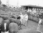 Mississippi youths visited the Fort Worth Stock Yards after winning livestock judging contests in their state. Left to right, R. M. Lancaster, extension worker, Harold Allen, and James Earl White, members of a judging team, are standing in a cattle pen inspecting the yards. Mr. Lancaster is petting one of the animals. Published in The Fort Worth Star-Telegram Evening Edition May 2, 1946.