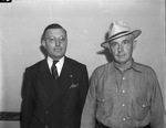 William E. Stepp, left, secretary-treasurer of the Anzac Oil Corporation of Coleman, Texas, one of the leading developers in the county, and L. J. Maxwell, president of Maxwell Drilling Company, also of Coleman. They are standing in front of a blank wall. Stepp is wearing a double-breasted suit and eyeglasses. Maxwell is wearing a long-sleeve, button-up shirt and a hat.