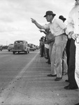 T. M. Sheffield, one of the Convair strikers, points a finger as he indulges in a customary call to workers passing through the line in their cars. Mr. Sheffield is wearing a hat, a striped button-up shirt with cuffed sleeves, and trousers. The other picketers are standing in line with him along the side of the road.
