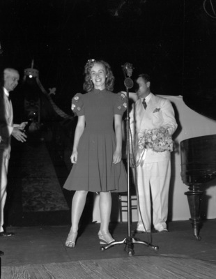 Gloria Byrnes, of Port Arthur, Texas, was crowned queen of the Texas Health and Beauty Festival at Mineral Wells, Texas. Dr. H. Arthur Zappe, president of the organization, is standing behind Miss Byrnes, at the right. He is holding a flower crown. They are standing on a stage as Miss Byrnes awaits to be crowned. She is wearing a dress.