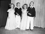 Standing left to right are first graders Lyndhan Shivers and Darrell Bentley, and second graders Peggy Dougherty and George Lindsey Gaston. The children were named princes and princesses at the Keller School May Fete. Lyndhan and Peggy are wearing floor length dresses adorned with bows. Darrell and George are wearing buttoned jackets and trousers. The children have their arms linked together. Published in the Fort Worth Star-Telegram morning edition, May 5, 1946.