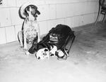 Zipper, long-time mascot of Meadowbrook Municipal Golf Course, is shown with a new litter of pups. There are eight puppies whose names cover every phase of the sport. Zipper sits beside her pups with a golfers' hat on her head. Atop the golf bag beside her are Birdie and Three-Putt. On the floor are Bogey, Par and Ace, and inside the bag are Eagle, Hook and Slice. Published in the Fort Worth Star-Telegram morning edition, May 5, 1946.